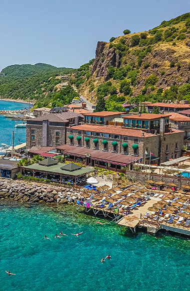 1880'li yıllarda palamut meşesi deposu olarak kullanılan yapı, 1987 yılında restore edilerek otel halini almıştır tarihi dokusu bozulmadan restore edilen bina kervansaray adını almıştır. 12 ay boyunca tarihi ve doğal güzellikleriyle Assos antik kentinin mistik havasını soluyacagınız denizin ve güneşin tadını çıkarabilecegınız her turlu imkanı misafirlerine sunmaktadır.